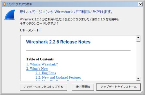 (図2) Wireshark 2.2.6 Updater 。 ( 画像サイズ 27.77 KB ) リリースノート: Wireshark https://www.wireshark.org/docs/relnotes/wireshark-2.2.6.html > Wireshark 2.2.6 Release Notes セキュリティアドバイザリー:Wireshark https://www.wireshark.org/…
