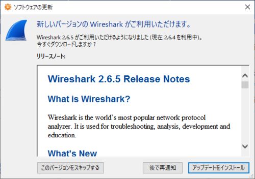 (図1) Wireshark 2.6.5 Updater 。 ( 画像サイズ 30.71 KB ) リリースノート: Wireshark https://www.wireshark.org/docs/relnotes/wireshark-2.6.5.html > Wireshark 2.6.5 Release Notes セキュリティアドバイザリー:Wireshark https://www.wireshark.org/…