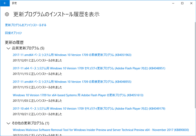 2017年12月の Microsoft Update 履歴。(Windows 10 [1709])